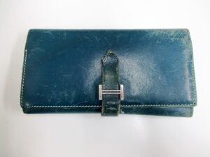 【HERMES】長財布 ブルー スレやキズも全体カラーリングで新品のような仕上がりに。 クリーニング 9,350円 再縫製修理 8,800円 全体カラーリング 9,350円 計 27,500円